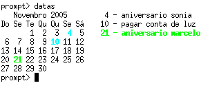 O dia atual é destacado (por padrão na cor verde) na saída do comando, e caso exista algum compromisso neste dia, ele também é destacado. Os demais dias com compromisso também estão em destaque (por padrão na cor azul claro). Estas cores podem ser facilmente modificadas no código fonte. Elas estão definidas nas variáveis COR_HJ e COR_DATA respectivamente.